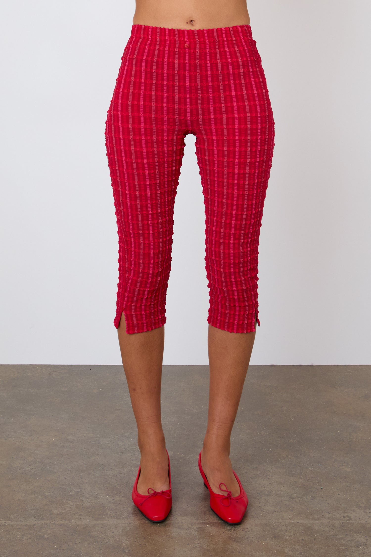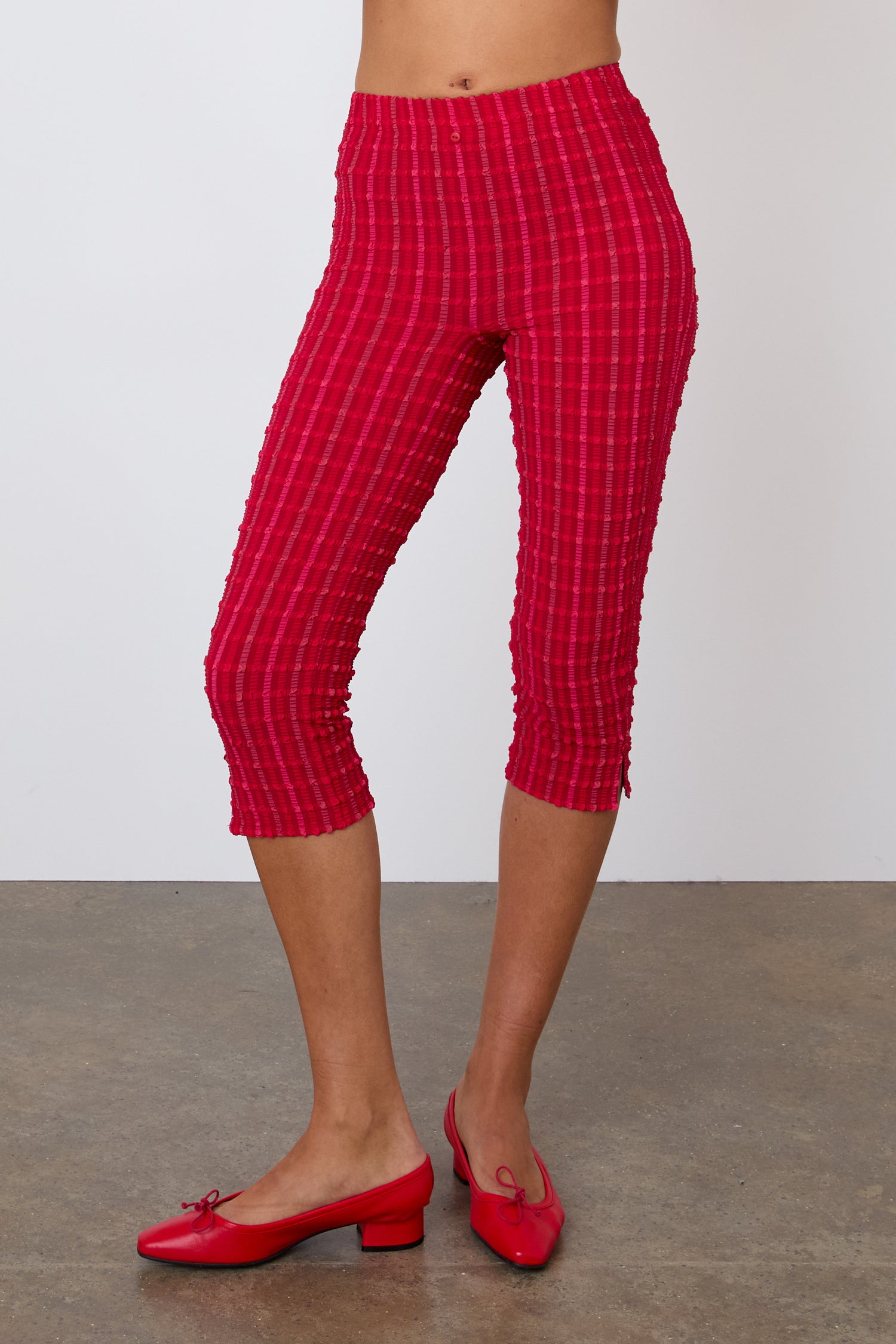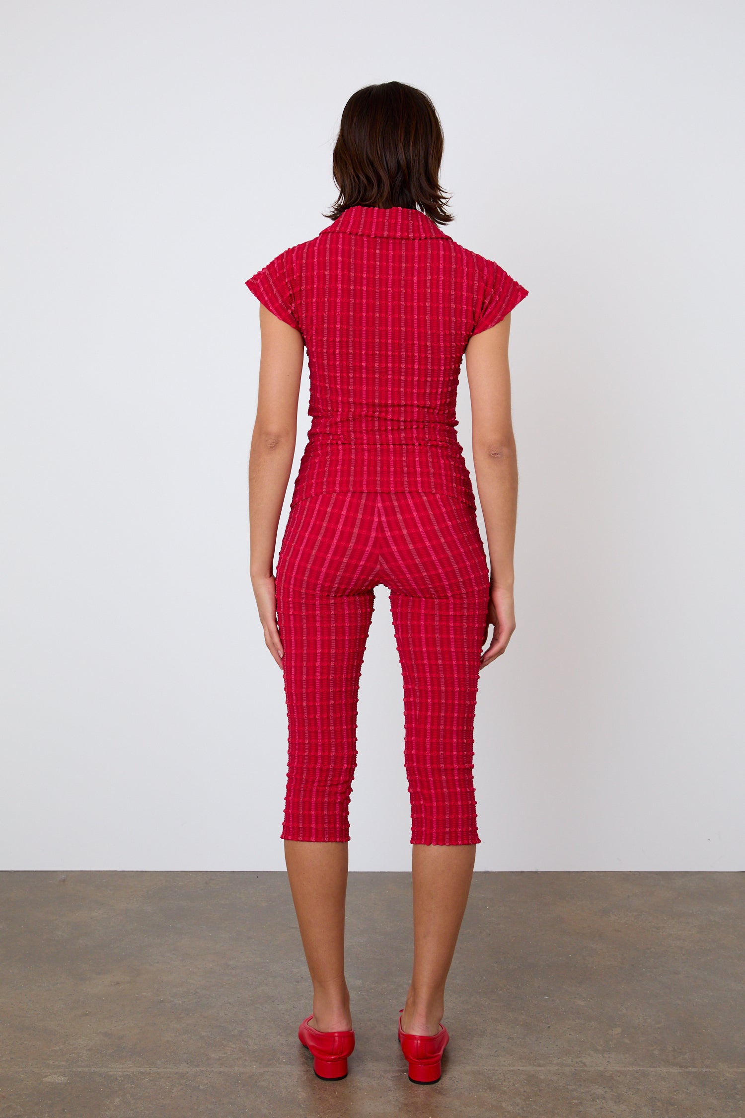 An elongated take on the classic bike short. Mid-rise fit with sculpting seams and side vents. Cut in recycled seersucker, now in Lipstick—a red and pink check inspired by classic lipstick shades.