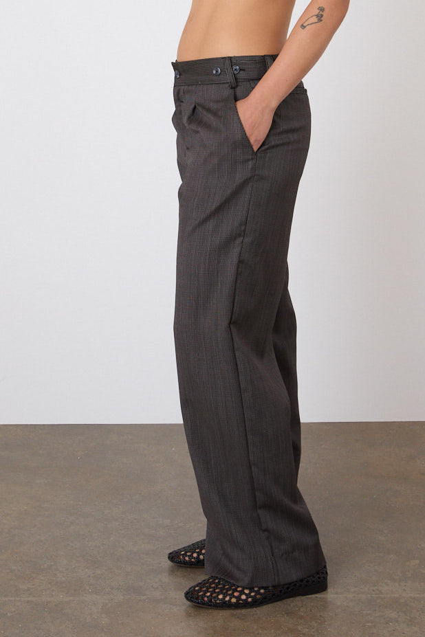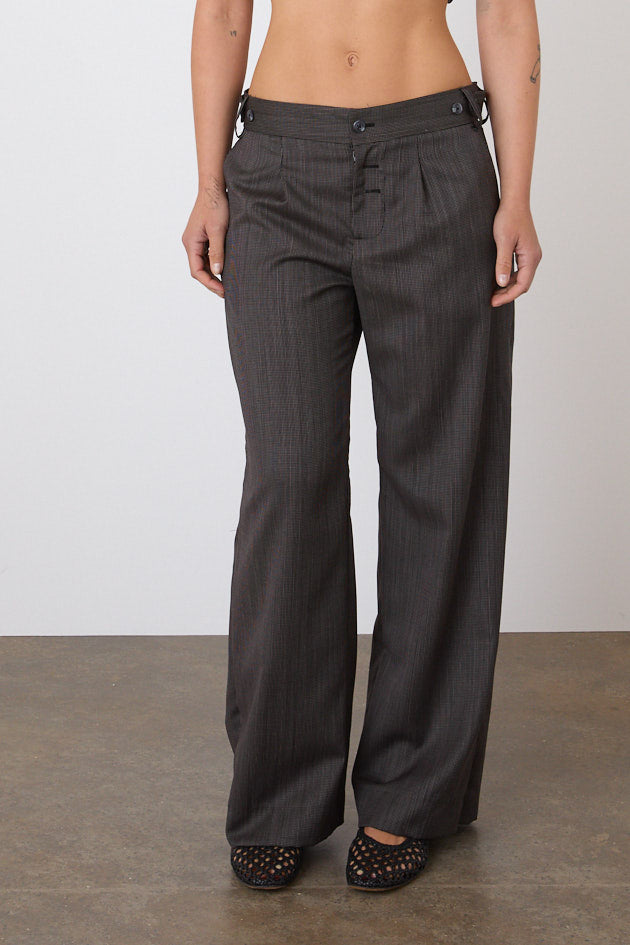 Black and white woven striped mid-rise, wide leg trousers crafted from deadstock fabric. Features button tabs at the waistband to be adjusted to your comfort and functional front pockets. Named after one of our favourite tailoring legends, Annie Lennox.