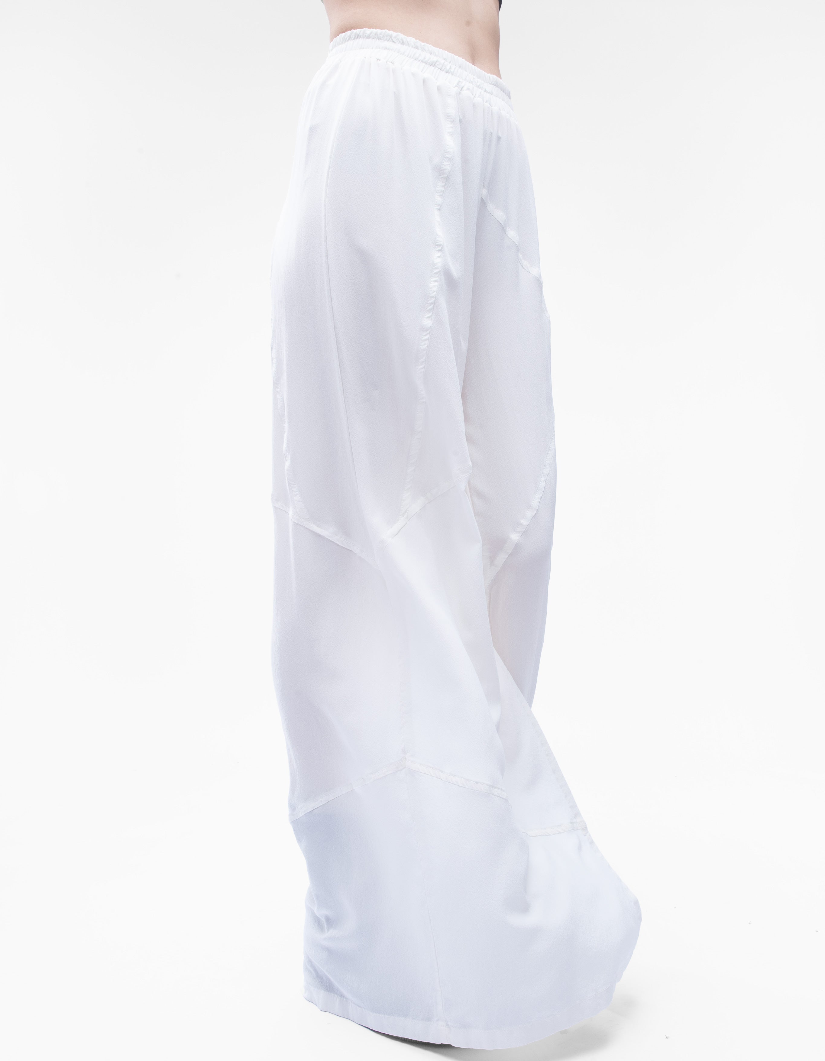 The trousers are slightly transparent.The length of the trousers is 104 cm from the high waist.
