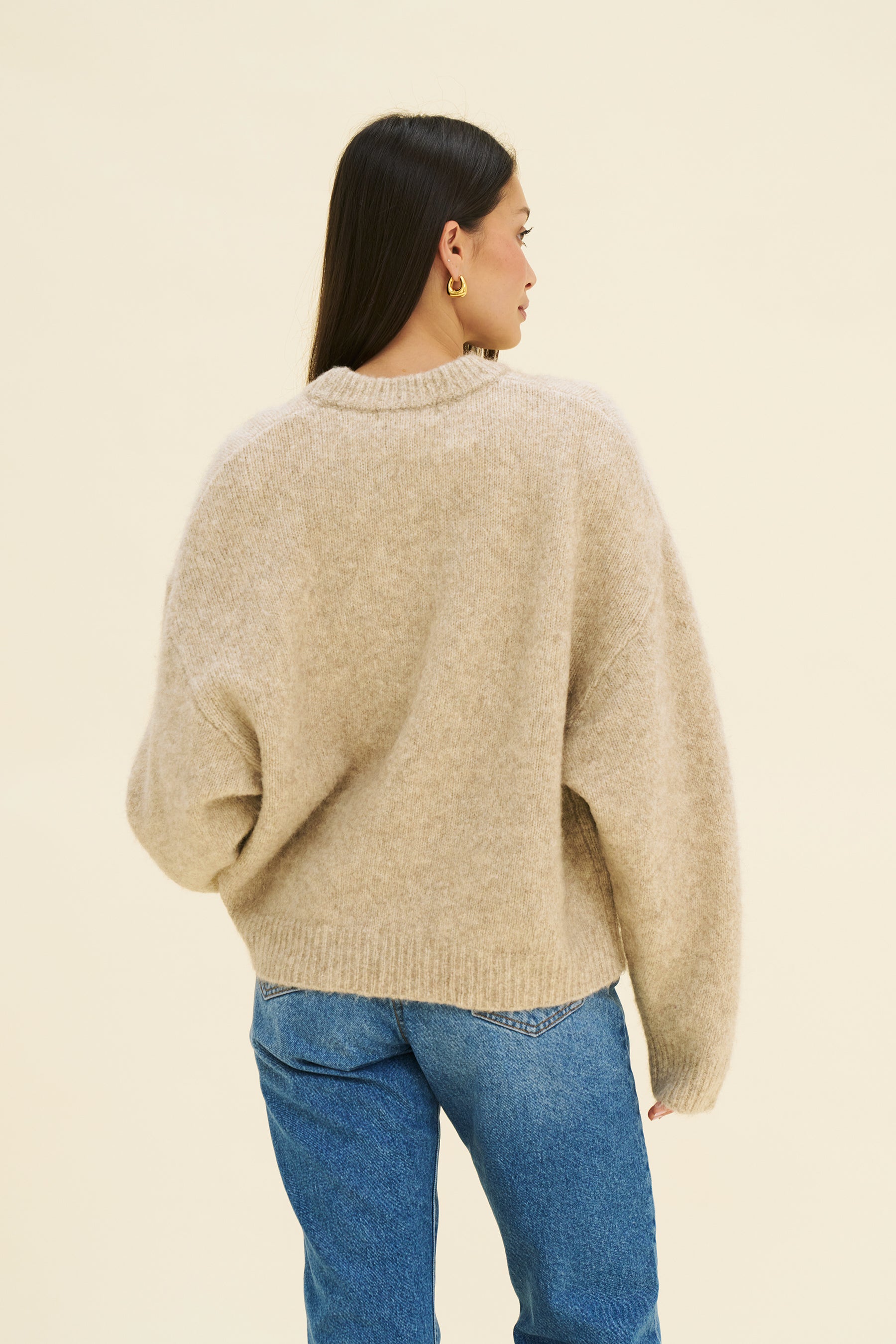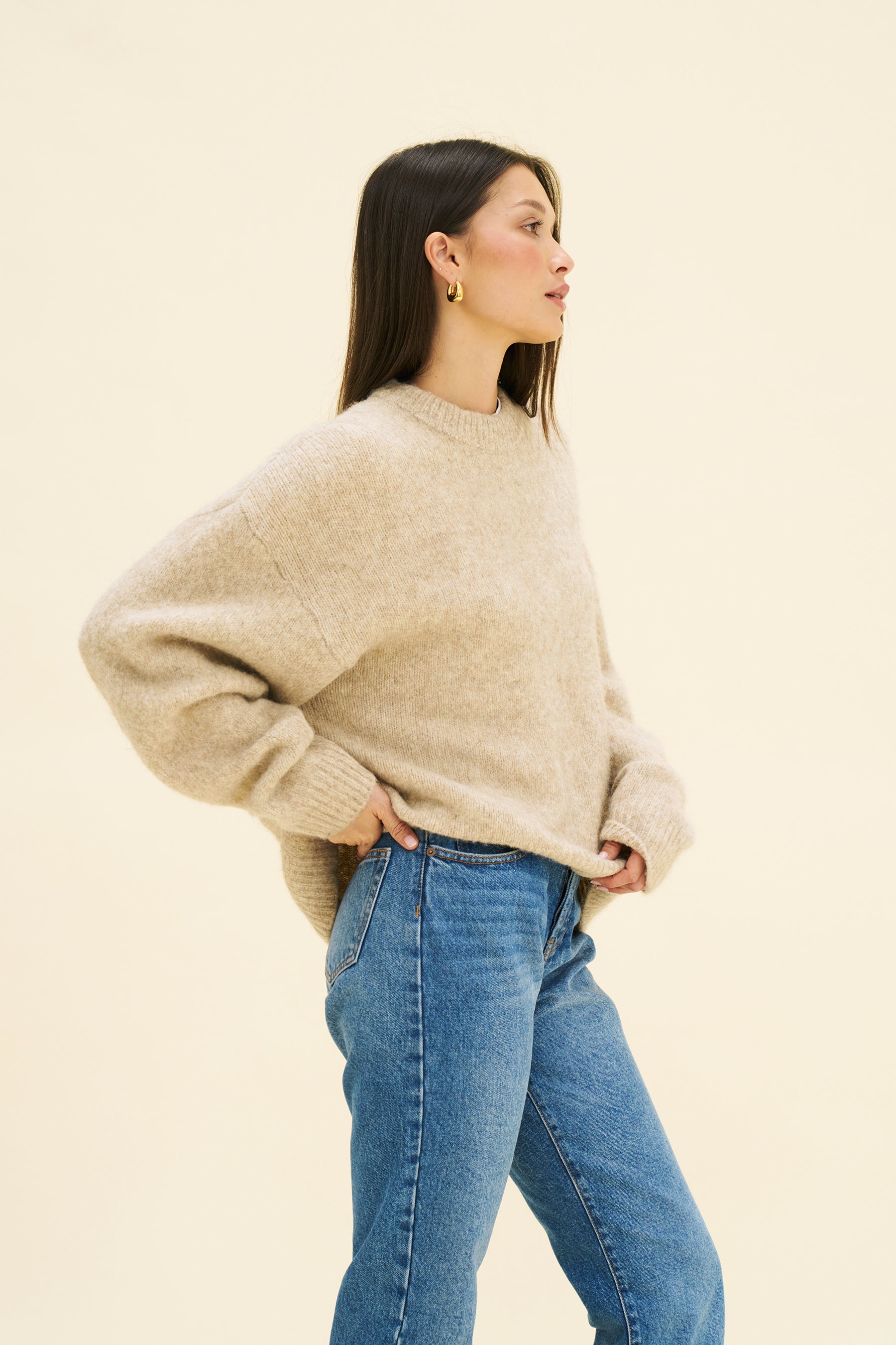 The Aurora is so fluffy and soft. An incredible blend of Yak, Alpaca and Merino. A simple crew neck with boyfriend fit. Model wears size M, she is 5'8.
