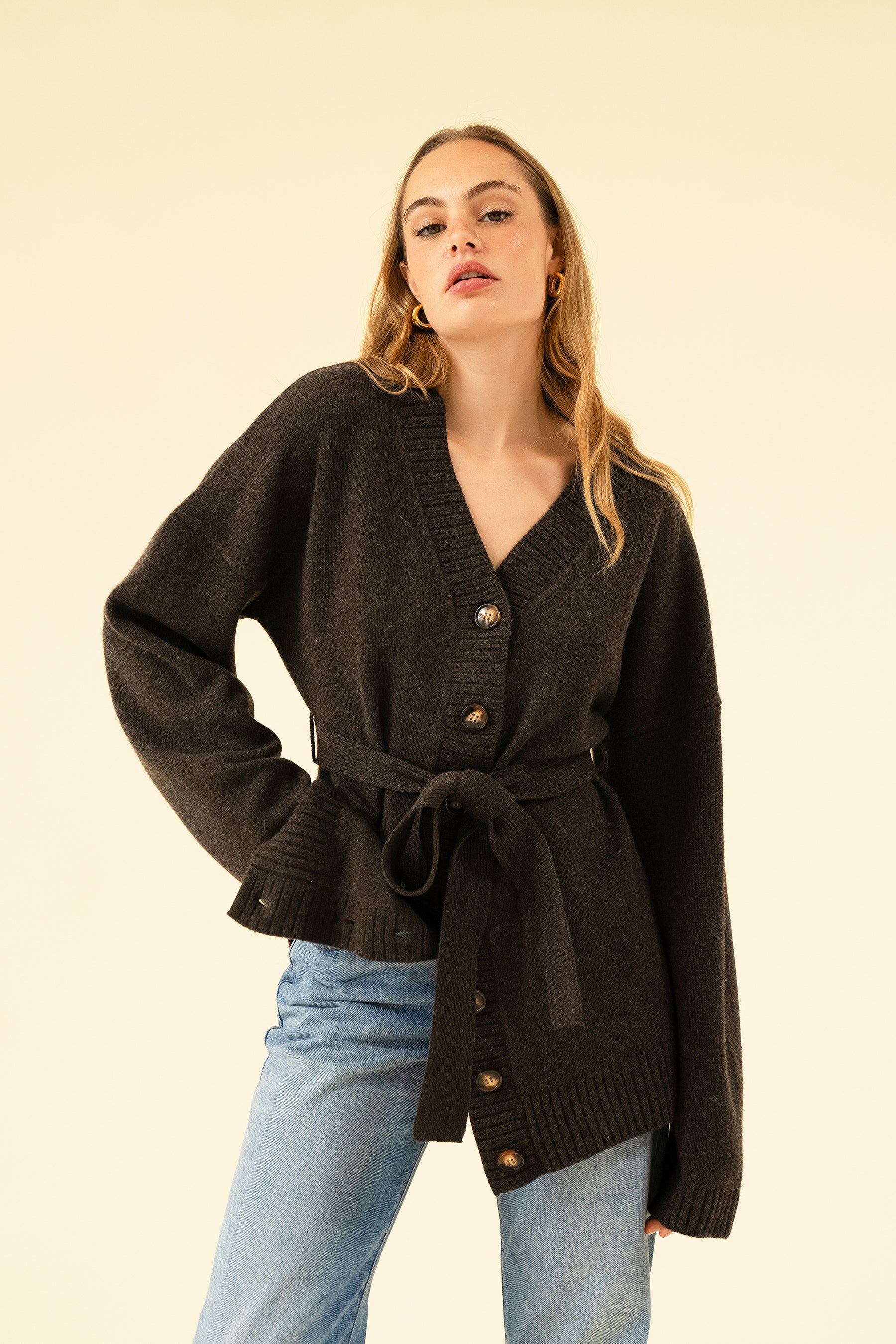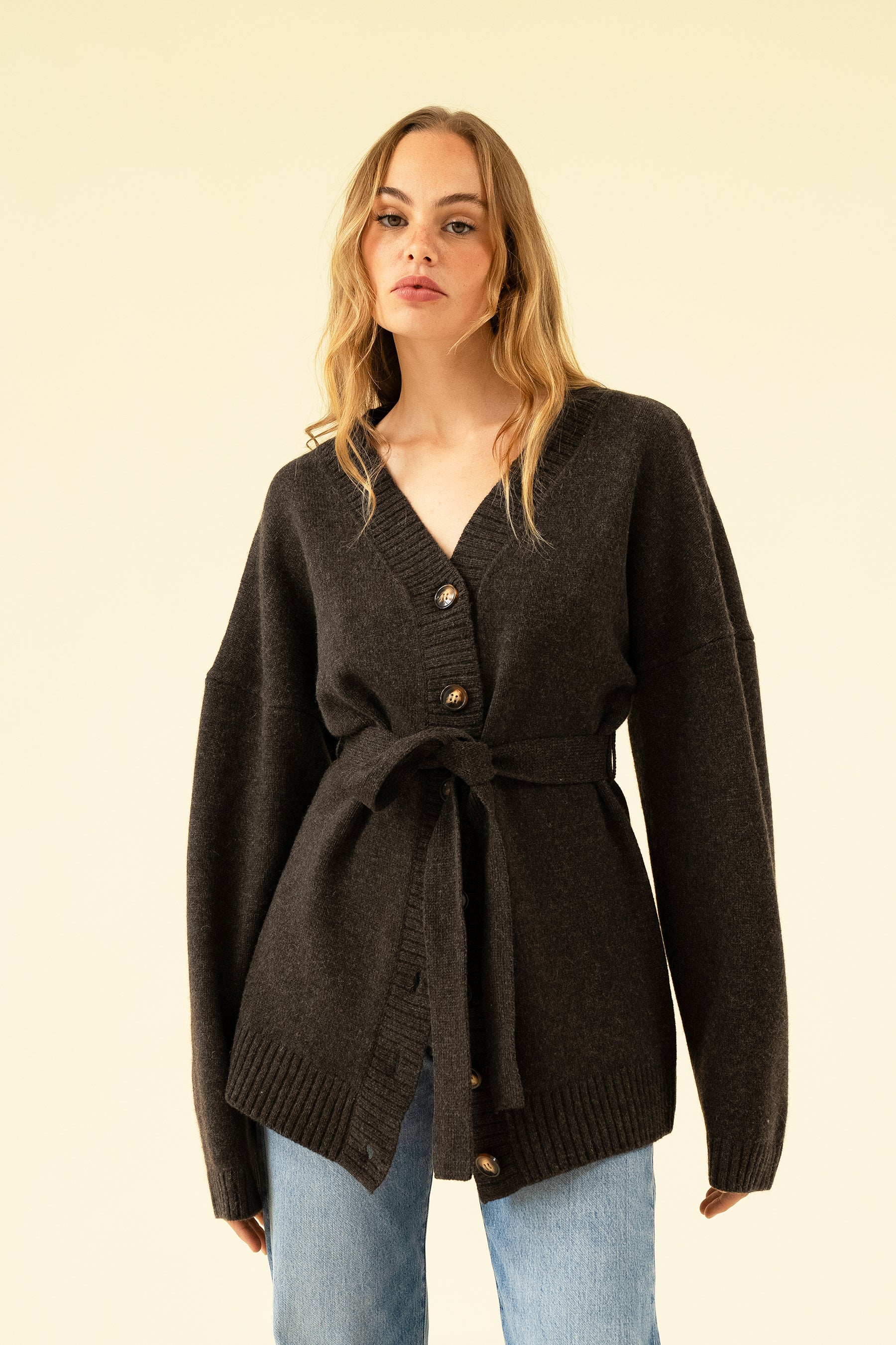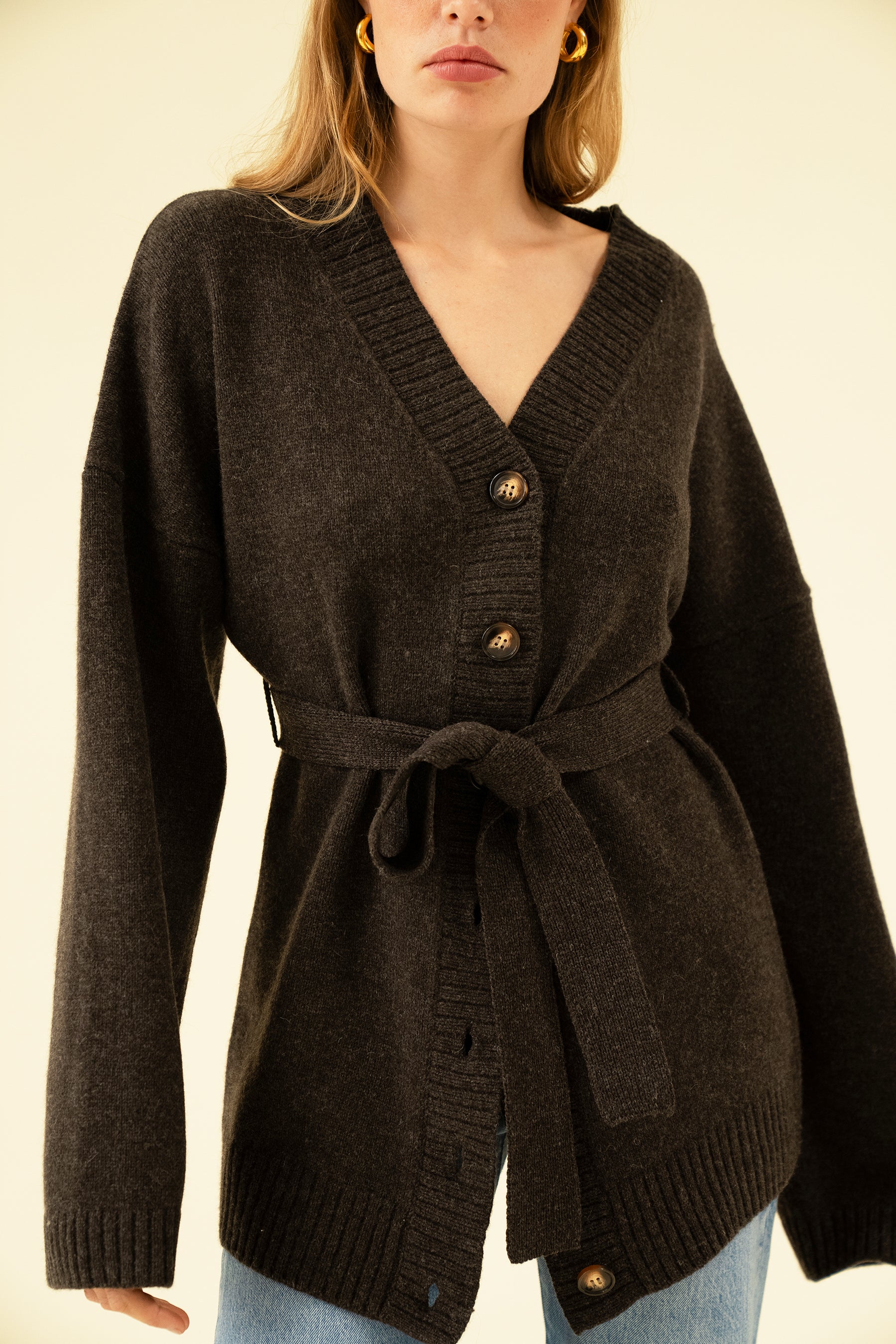 The Callie is a longline cardigan with a knitted waist tie. Cosy up in 100% RWS certified Merino Wool in a statement knit. Model wears size S, she is 5'9.