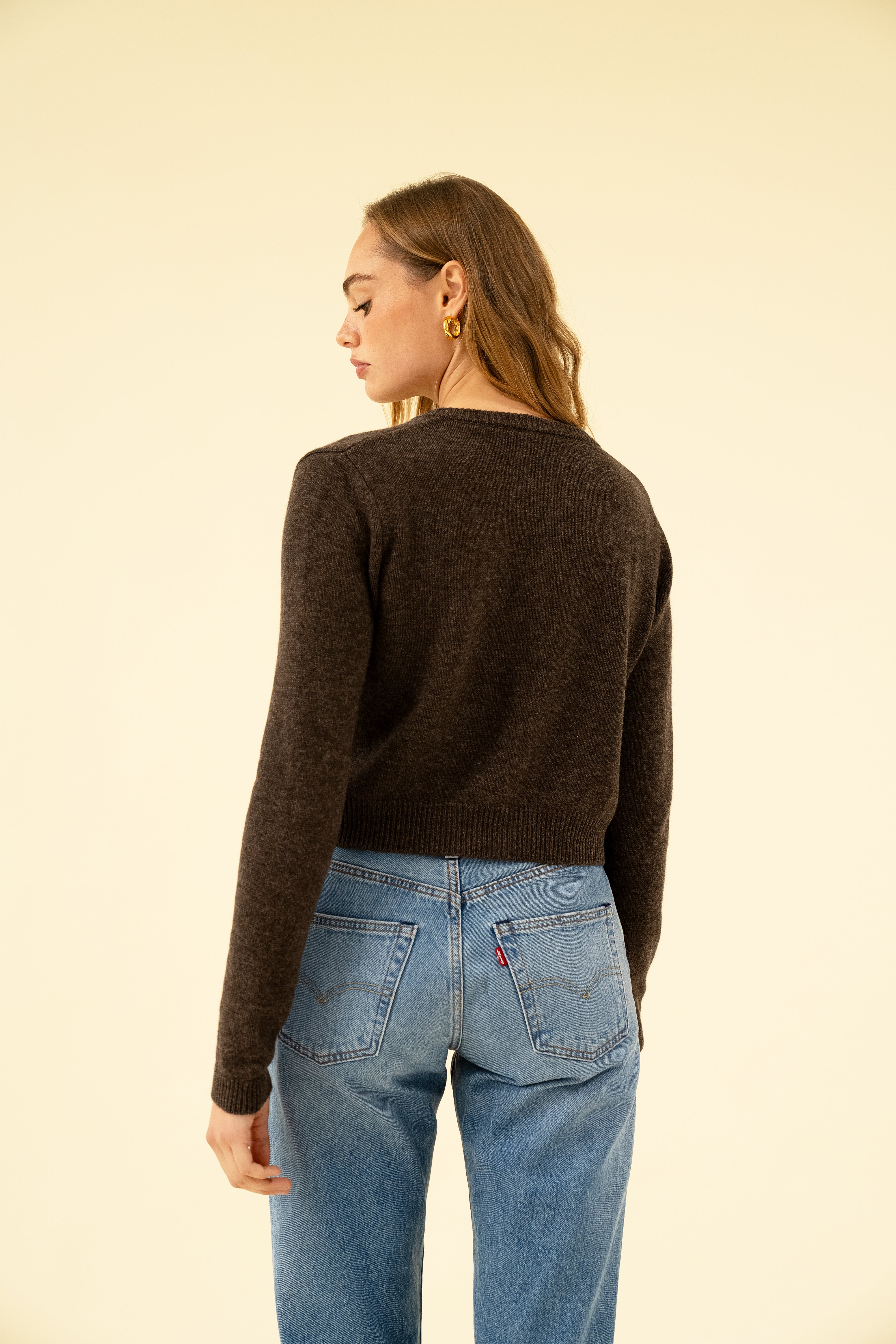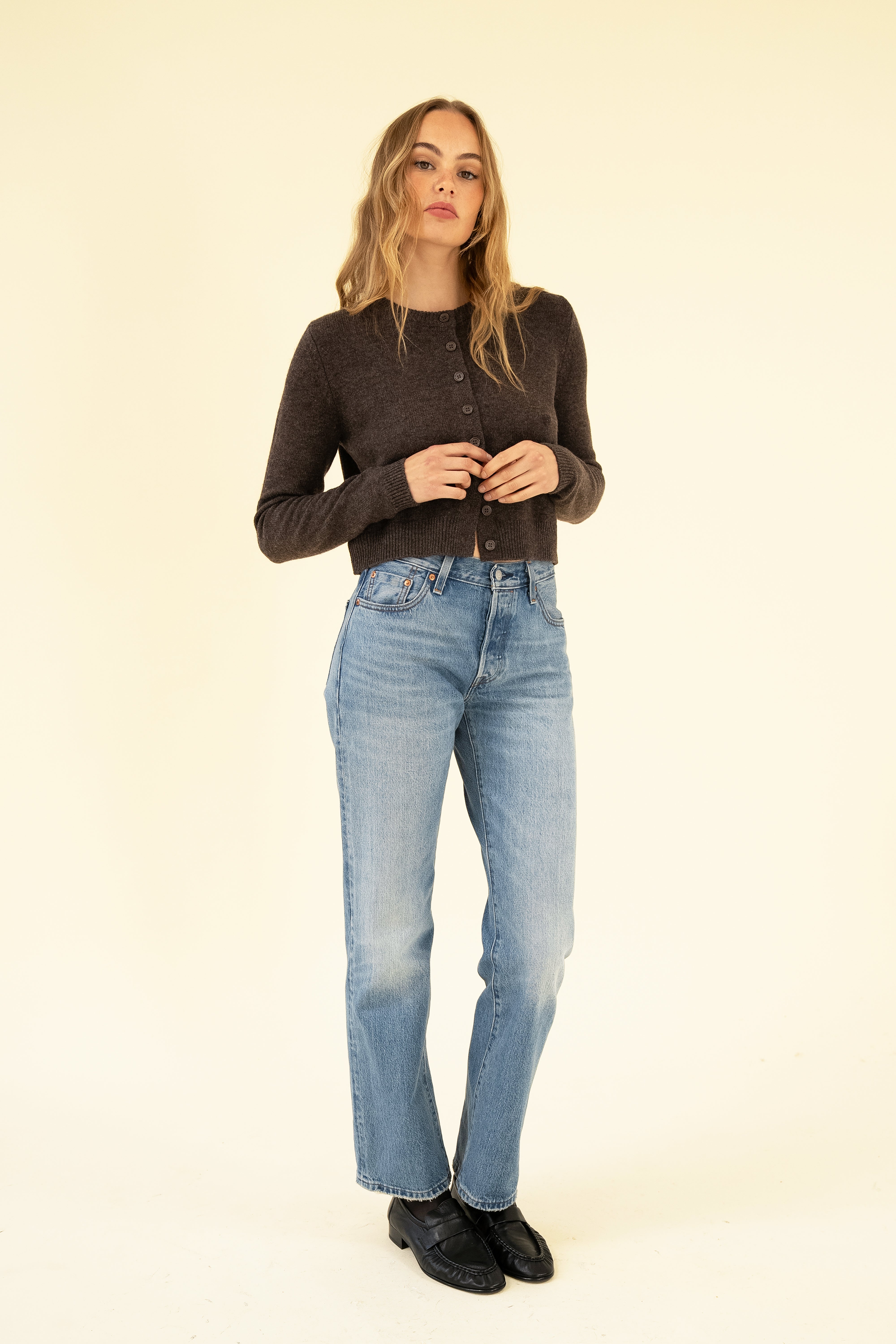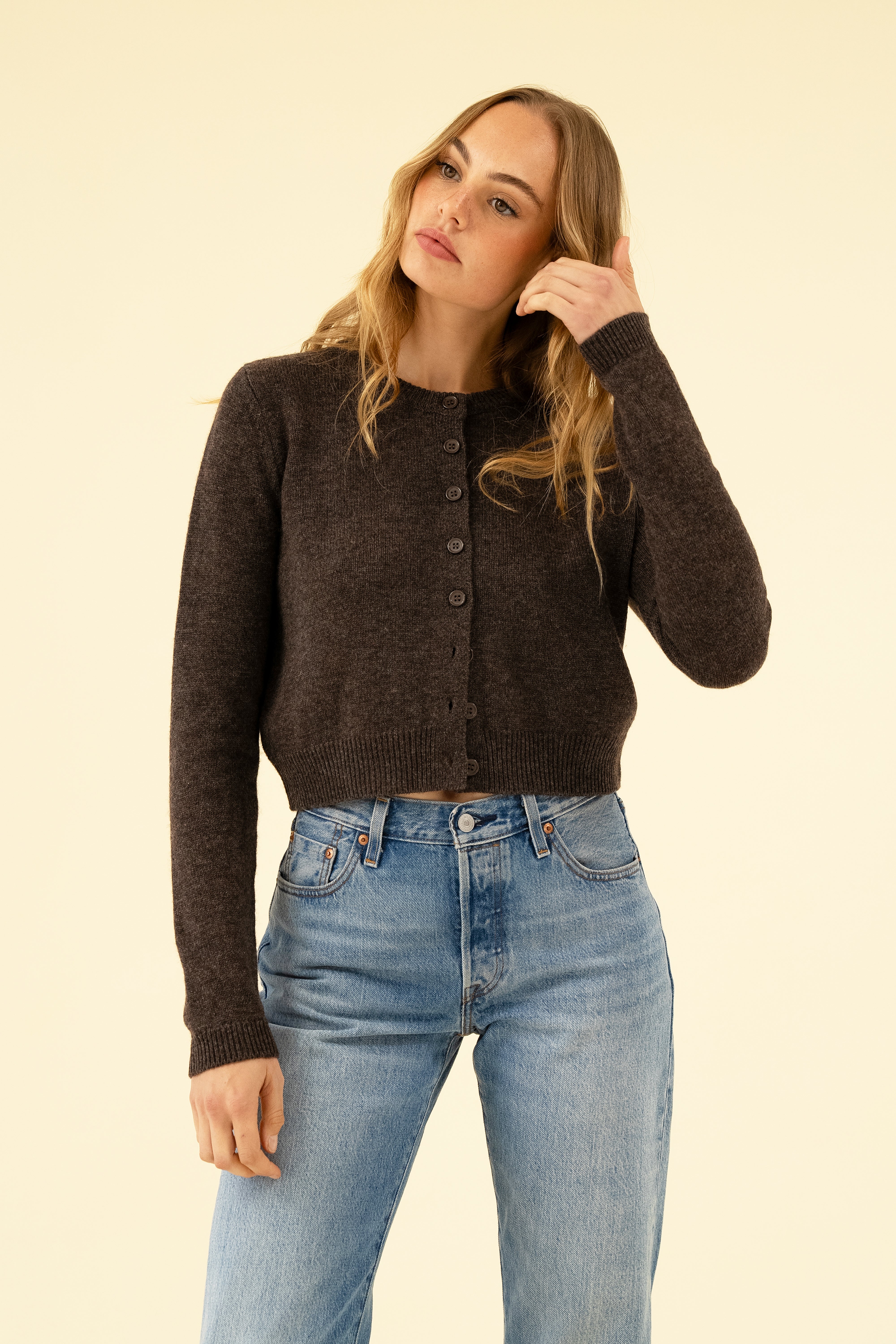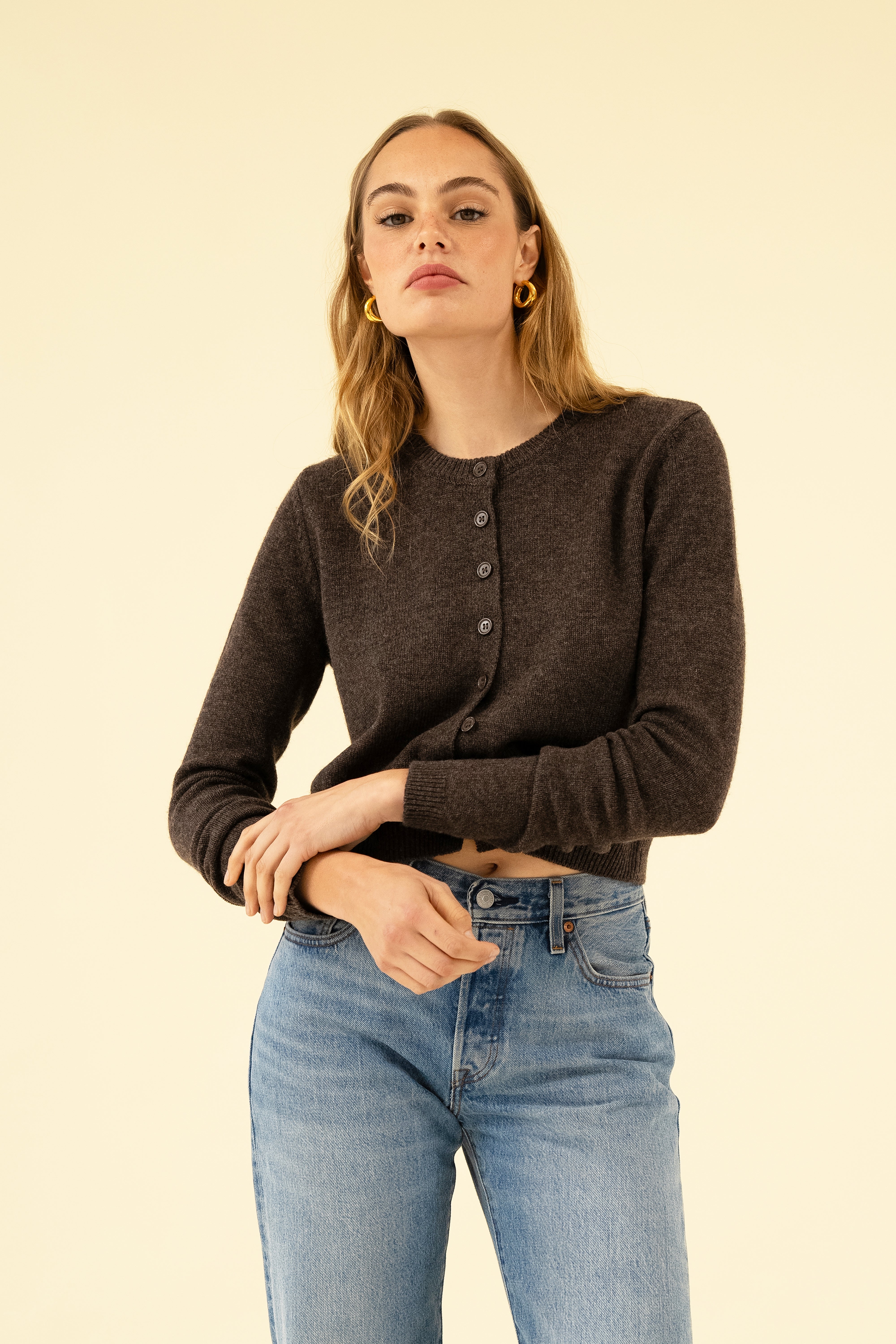 Charlotte is a simple crew cardigan with boxy fit. Made from a RWS Merino wool & Cashmere blend. Model wears size S and is 5'9.