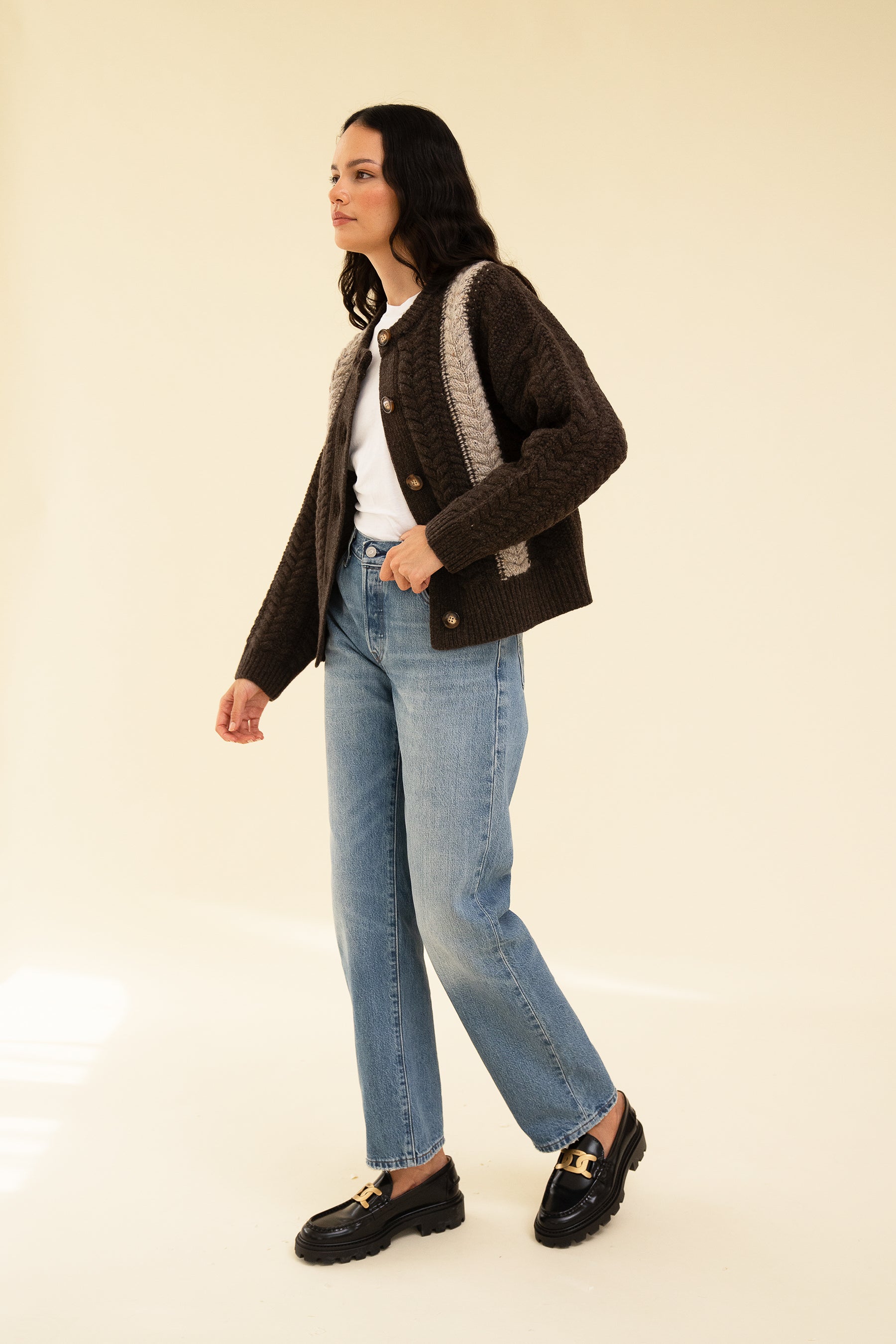 Our classic Sloan cardigan, made from RWS Merino wool, recycled Nylon and Alpaca for the highest quality knit. Wear her fully buttoned or over a fresh white tee for a clean fit with your favourite jeans. Model wears size M and is 5'9.