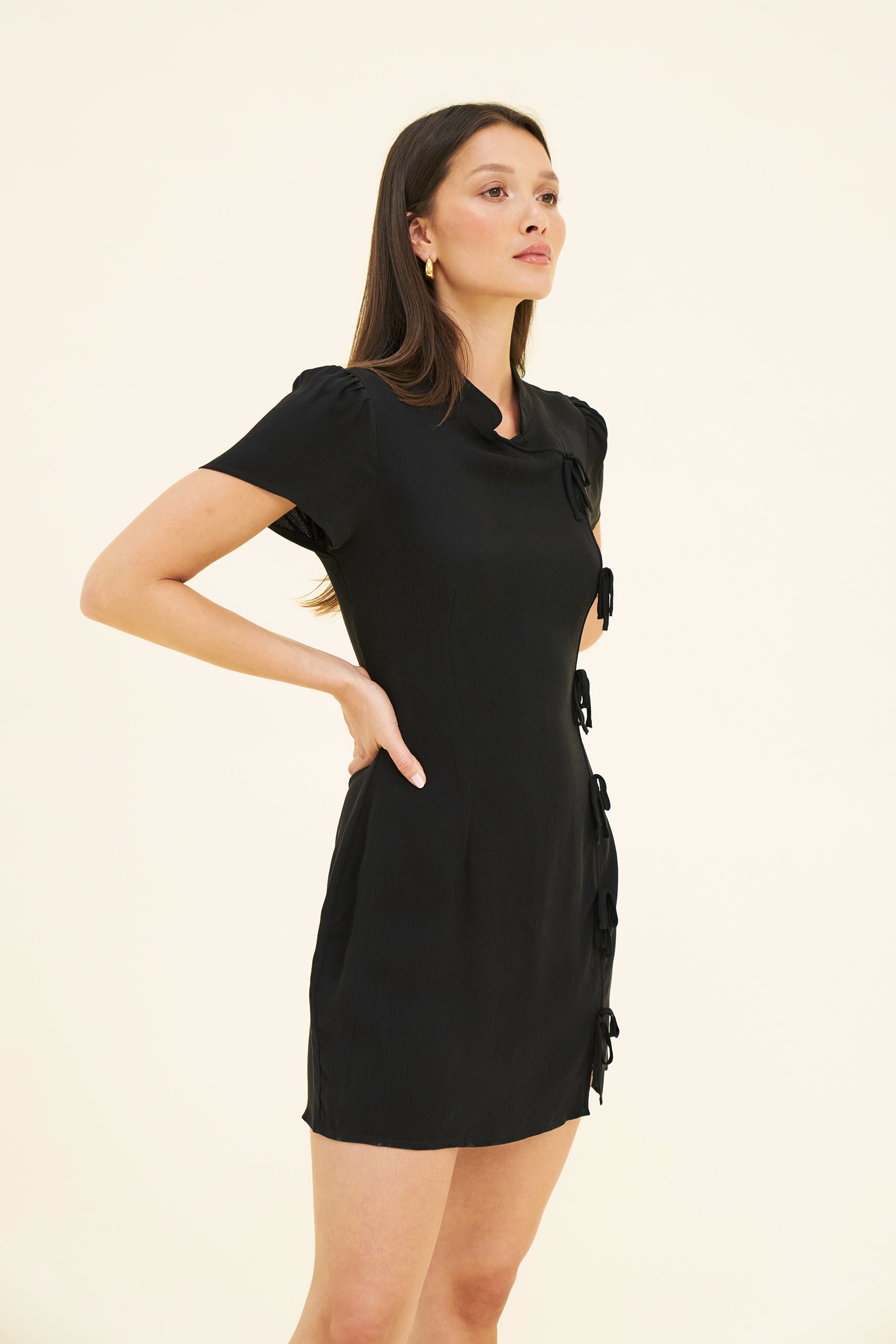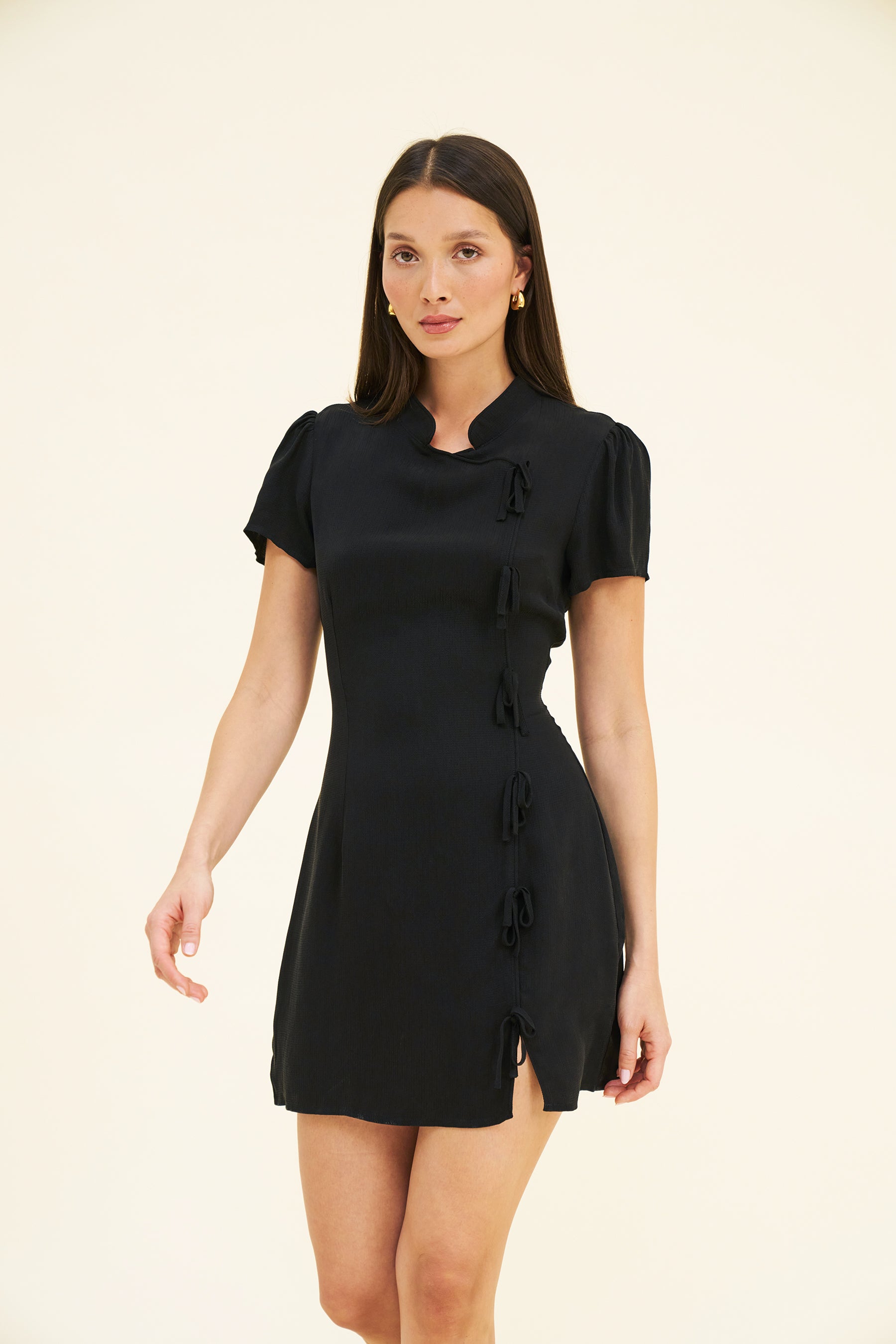 The Yua is a Chinese inspired LBD, the cutest tie details and textured fabric. Made from a silky soft Cupro blend. Model wears size XS and is 5'10.