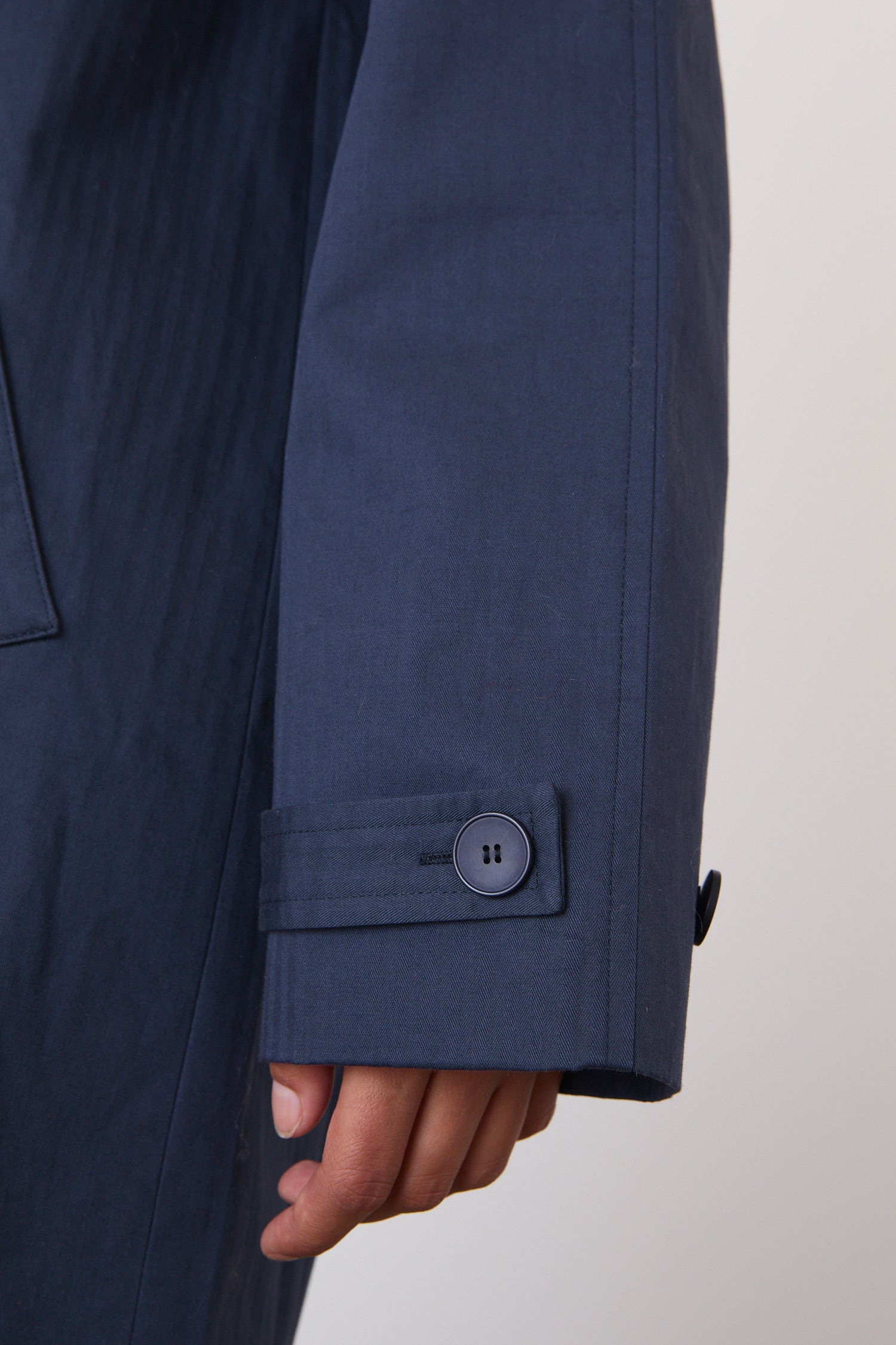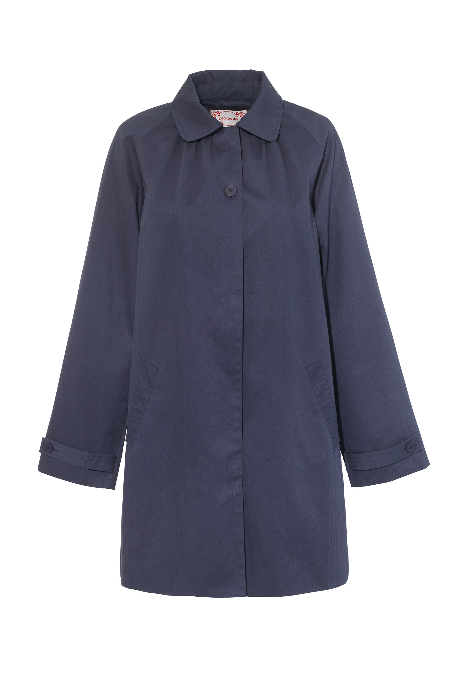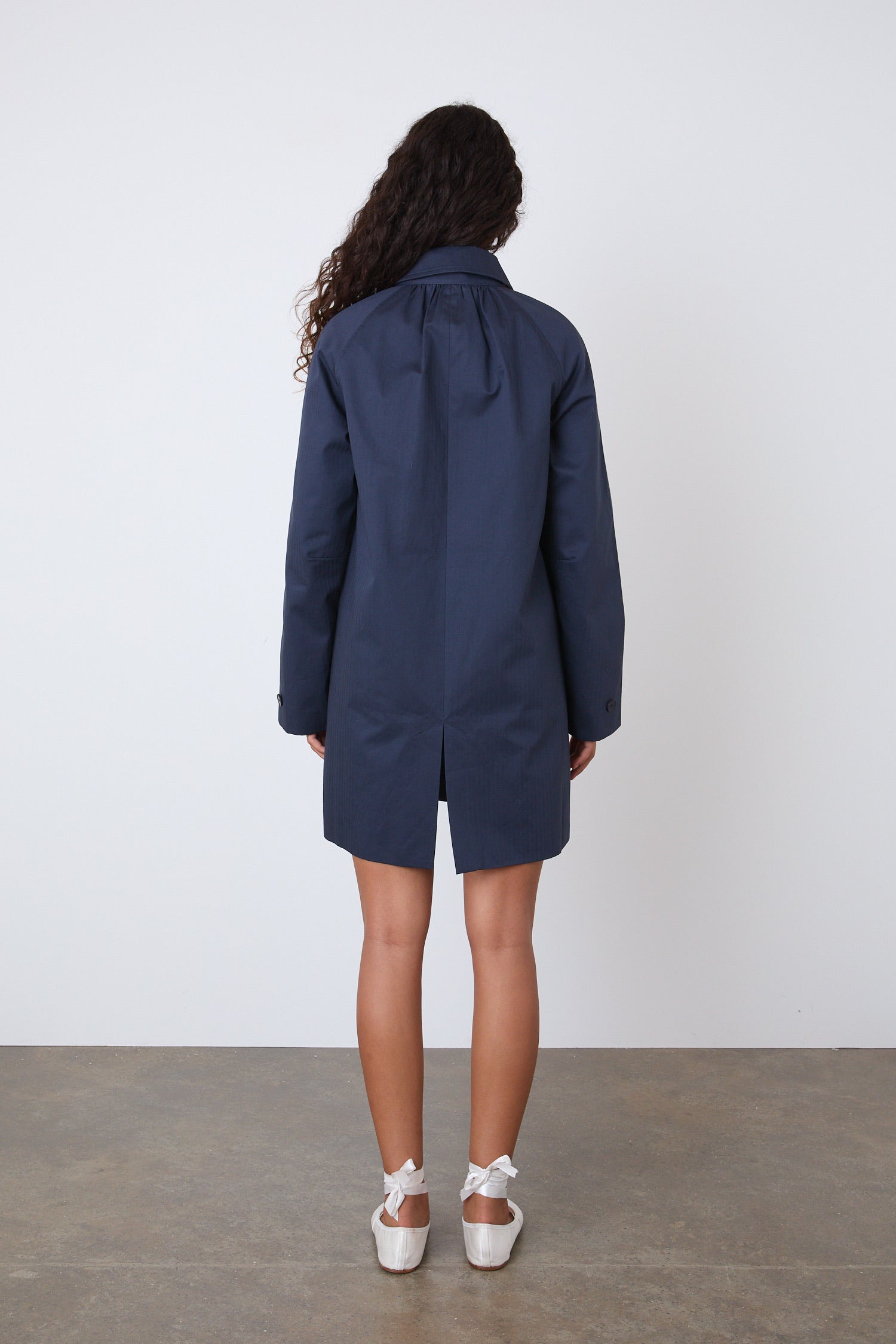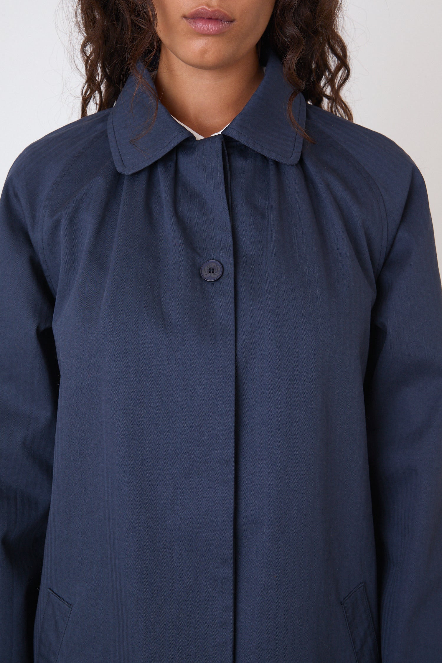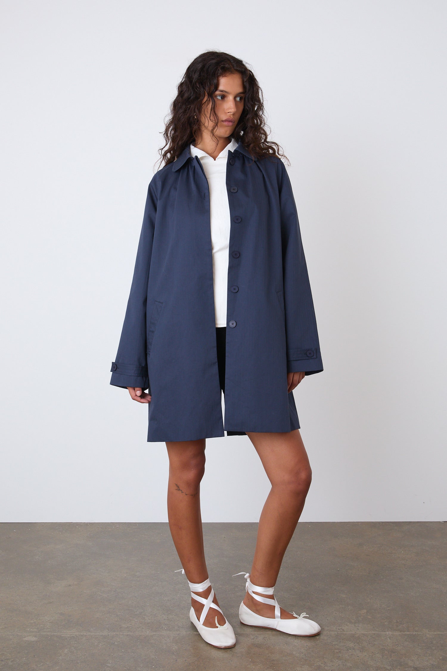 A mid-length trench coat with a feminine silhouette and soft gathering behind the collar.