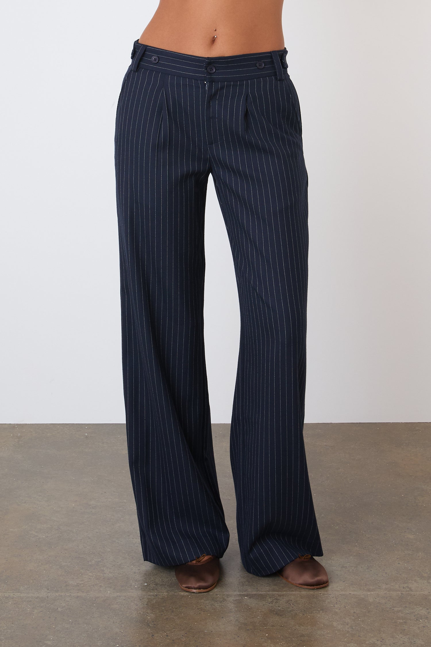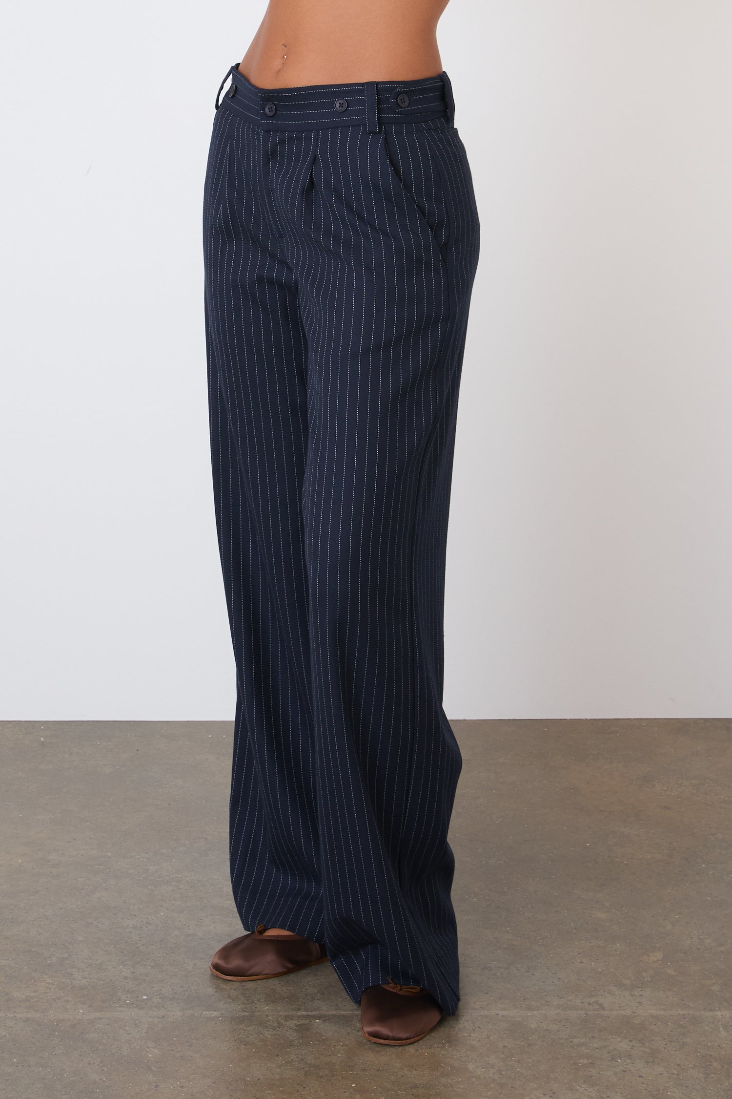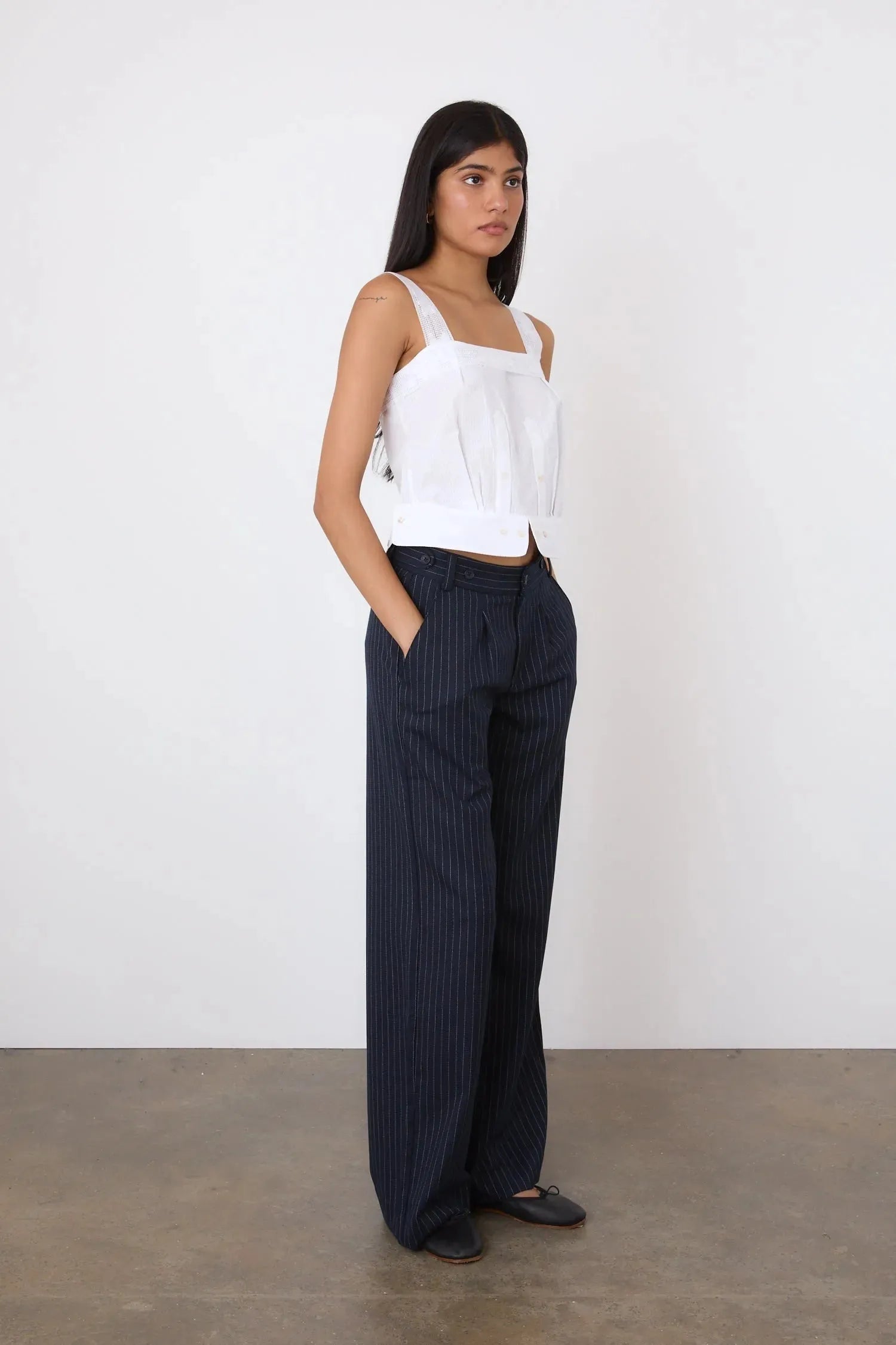 Relaxed, mid-rise, wide leg tailored trouser. Features an edge stitched pleat at the centre of the leg, functional front pockets and a v-shaped back yolk with welt pockets. Complete with tonal mock horn button tabs at the waistband you can adjust to your comfort. Named after one of our favourite tailoring legends, Annie Lennox.