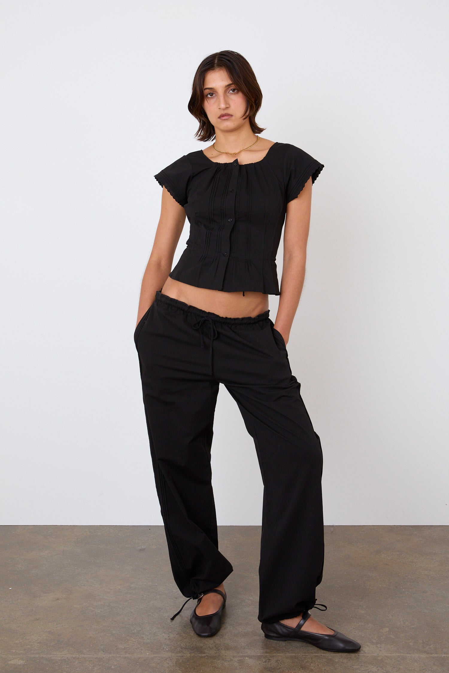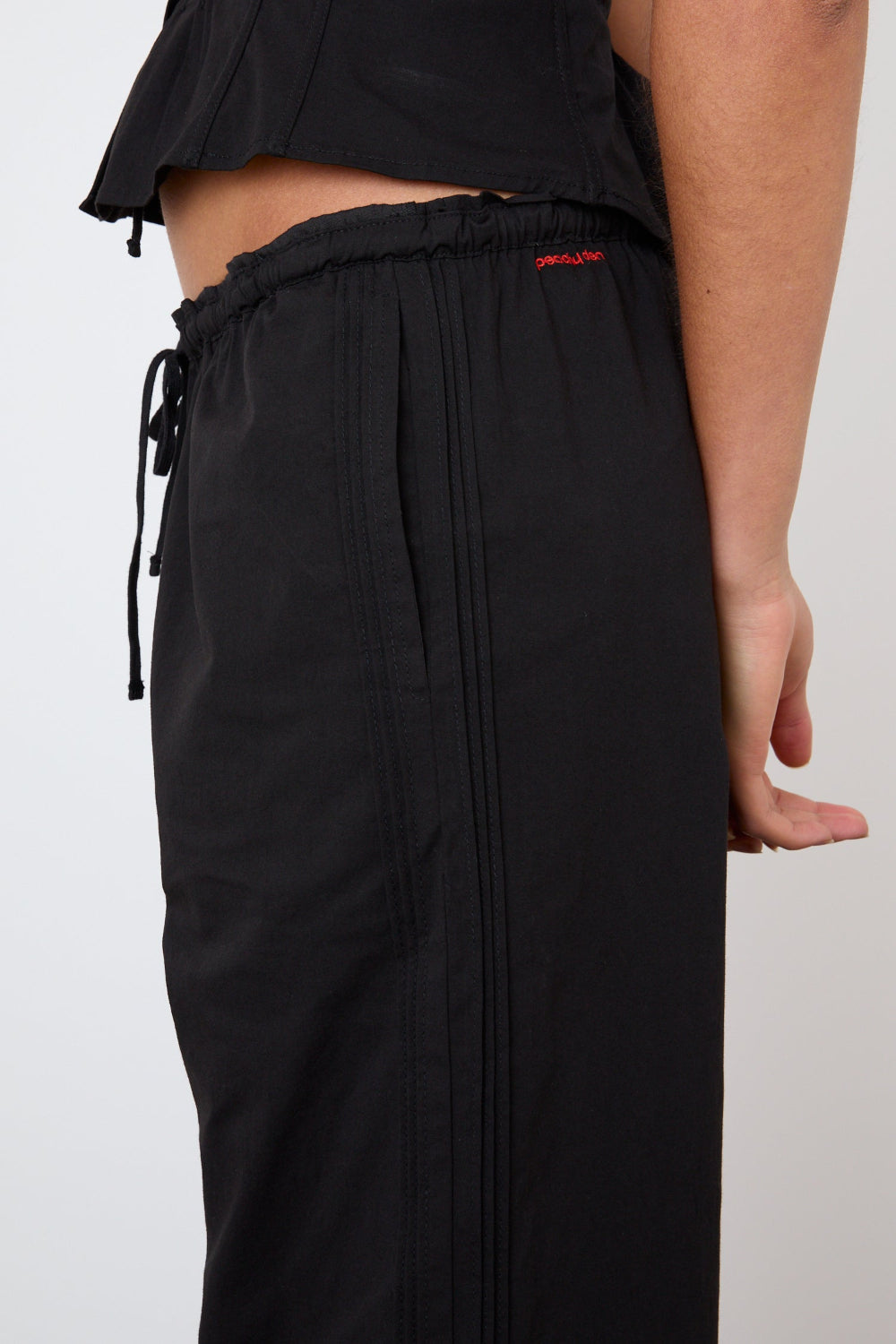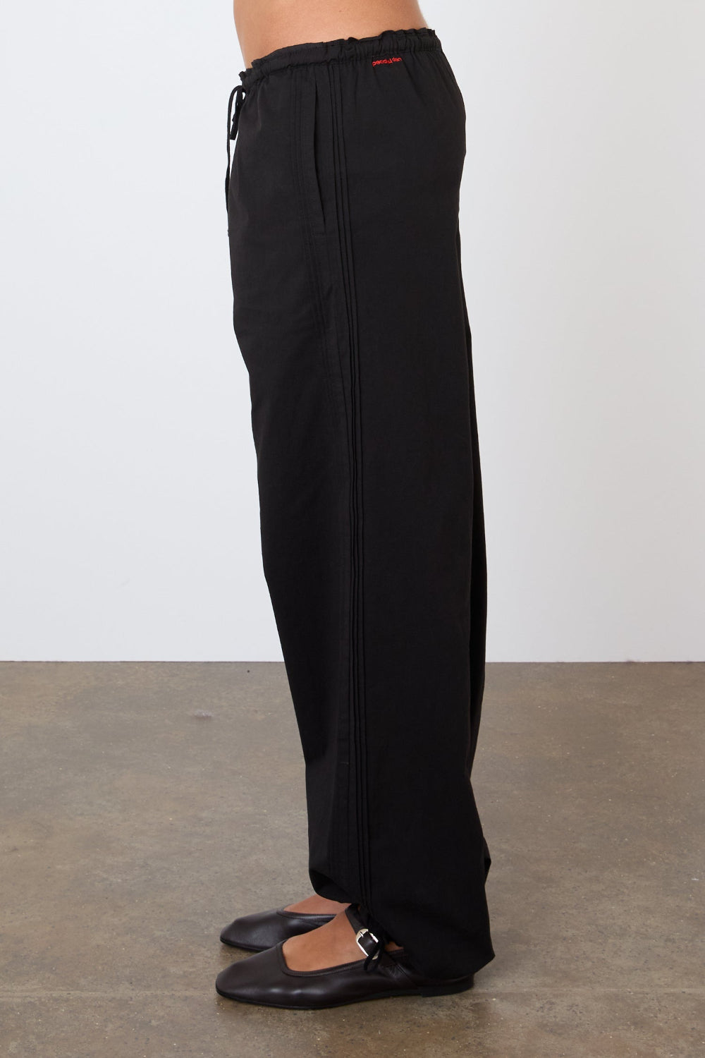 Inspired by the cottons and linens of 1930s Parisian markets and the French Riviera, The Renee Trousers in Onyx feature delicate detailing with fine pin tucks. Designed for comfort, they offer adjustable hems and waist for a perfect fit, finished with a red pop logo.