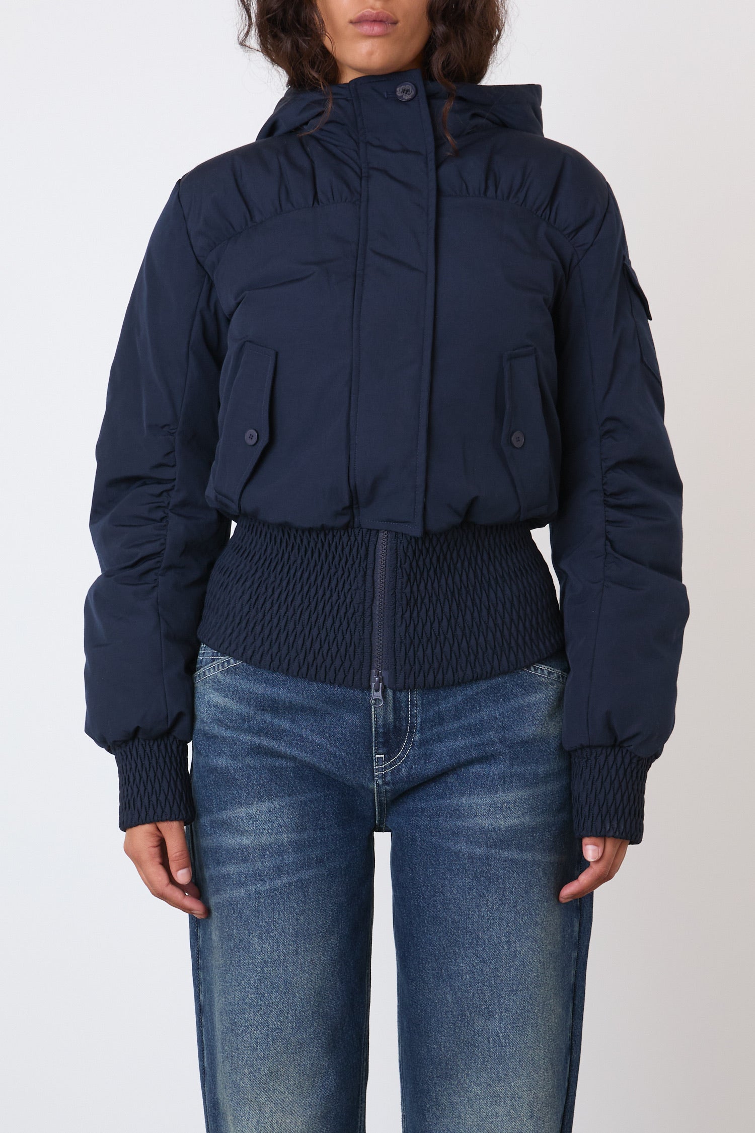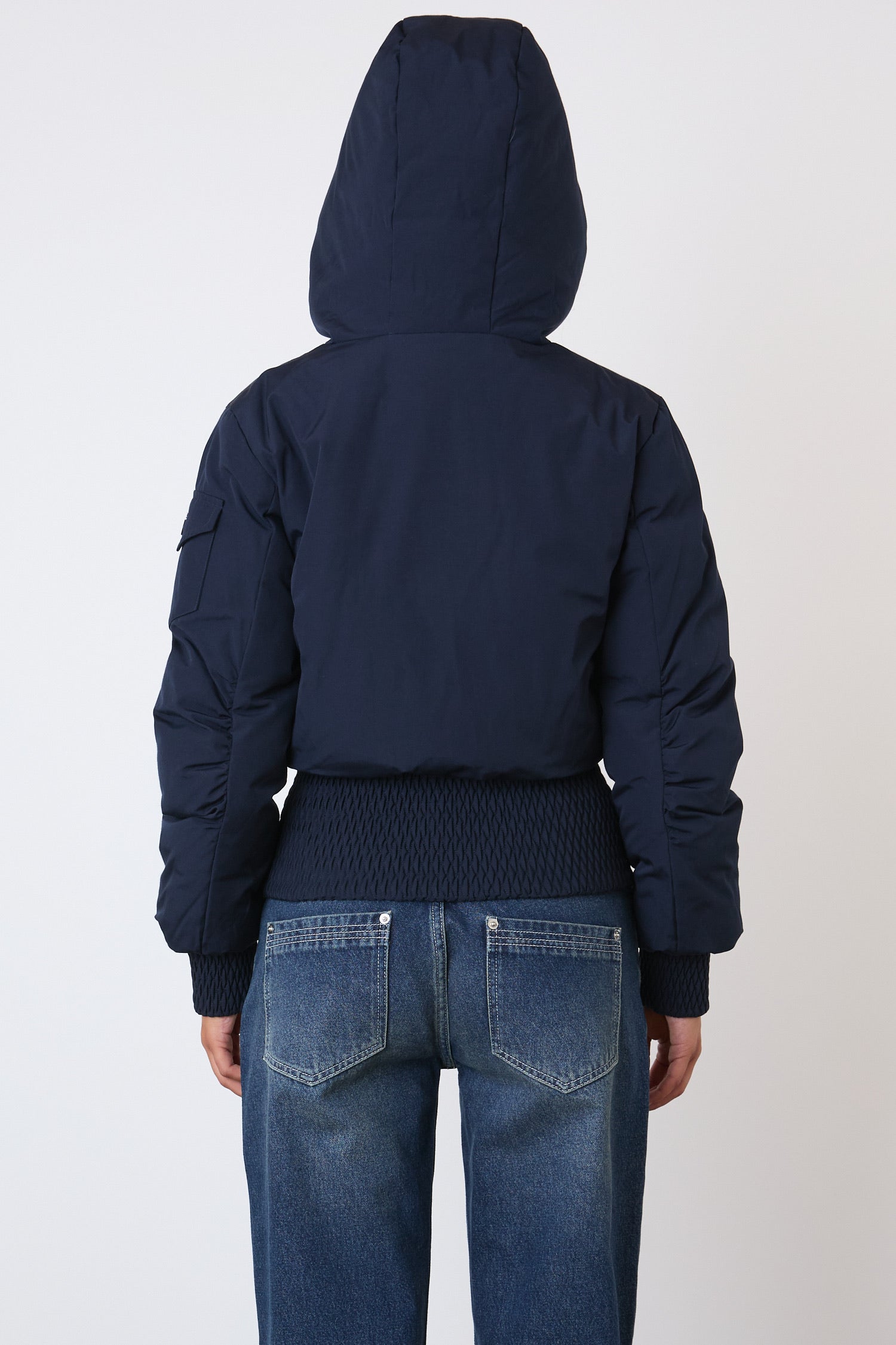 A hooded puffer jacket inspired by the jackets of the early 2000s, with a deep smocked waistband that cinches the waist.